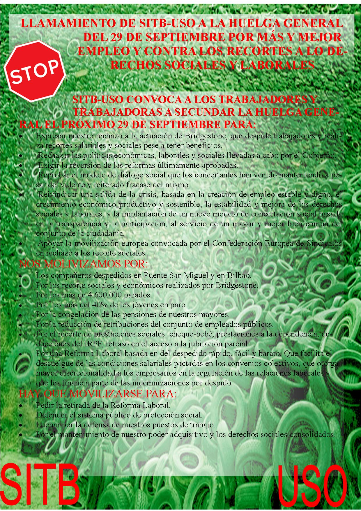 El Sindicato Independiente de Trabajadores de Bridgestone apoya la huelga general convocada por la Unión Sindical Obrera para el próximo día 29 de septiembre y considera que se hace necesaria la movilización en Bridgestone por existir motivos sobrados no sólo ante la actual situación de deterioro de la economía y del trabajo, del empleo pleno, de sus derechos y valores a nivel nacional, sino también por las perdidas y los recortes sufridos en los últimos convenios por los trabajadores y las trabajadoras de Bridgestone.