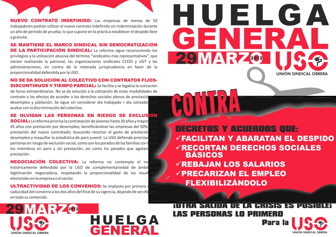 La Unión Sindical Obrera (USO), tercera organización sindical en nuestro país, ha decidido convocar Huelga General en la misma fecha en que lo han hecho sus dos homólogas confederaciones sindicales – 29 de marzo-, pero realizando una convocatoria propia y diferenciada de estas últimas.