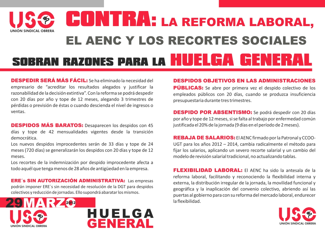 La USO llevará su campaña de movilización a todos los trabajadores, para la implicación tanto de quienes tienen empleo en los diferentes centros de trabajo como de las personas que hoy carecen del mismo, por suponer dicha Reforma Laboral unas leoninas condiciones laborales y retributivas para su incorporación al empleo y su permanencia en el mismo, y exigir la cobertura social suficiente para las personas desempleadas que no perciben ningún tipo de prestación.