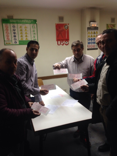 Hoy, tras la asamblea de SITB en Burgos, Juan Carlos Lopez y Juan Carlos Sanchez, hacen entrega a nuestros afiliados de los cheques de la CAJA DE RESISTENCIA Y SOLIDARIDAD de la USO que paga los días de huelga a los afiliados.